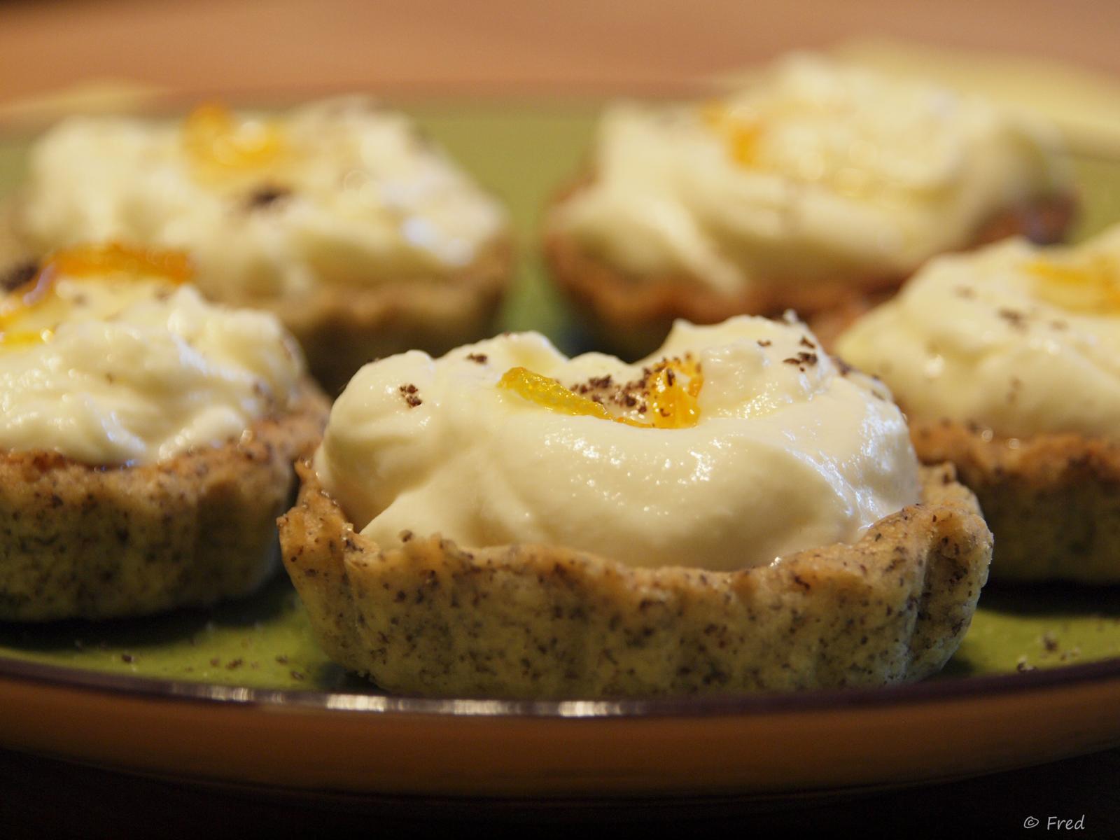 Für den Teig die kalte Butter in Würfel schneiden und mit den Knethaken des Rührgeräts und dem Mehl, dem Zucker, dem Mohn, dem Ei und dem Salz verkneten. Den Teig 30 Minuten ruhen lassen und dann auf den Boden und den Rand der Tartlette Füörmchen verteilen. Mit einer Gabel den Boden einstechen und die Böden bei 200°C Umluft 10 Minuten backen. Dann erkalten lassen.